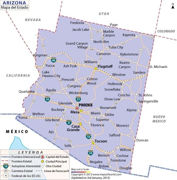 Arizona state map. Mapa de Arizona Estados Unidos. Descubre donde esta Arizona en el mapa y las fronteras de Arizona.. ¿Cual es la capital de Arizona?